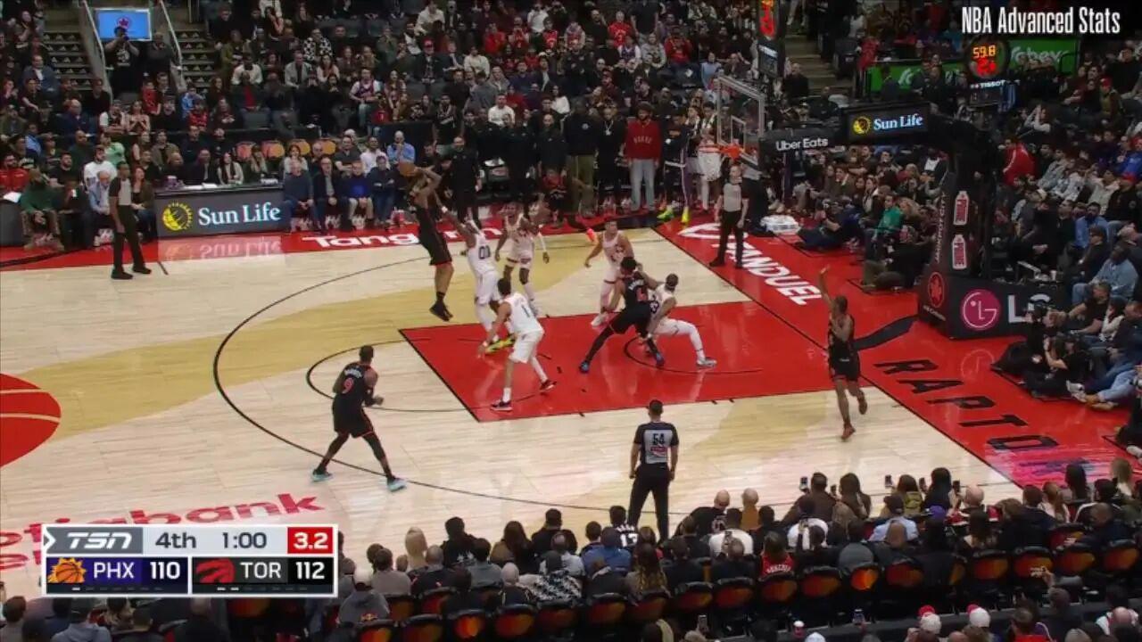 ——剩下31.7秒前,接巴雷特传球,底角大空位三分命中,这一球过后猛龙领先至10分,杀死悬念